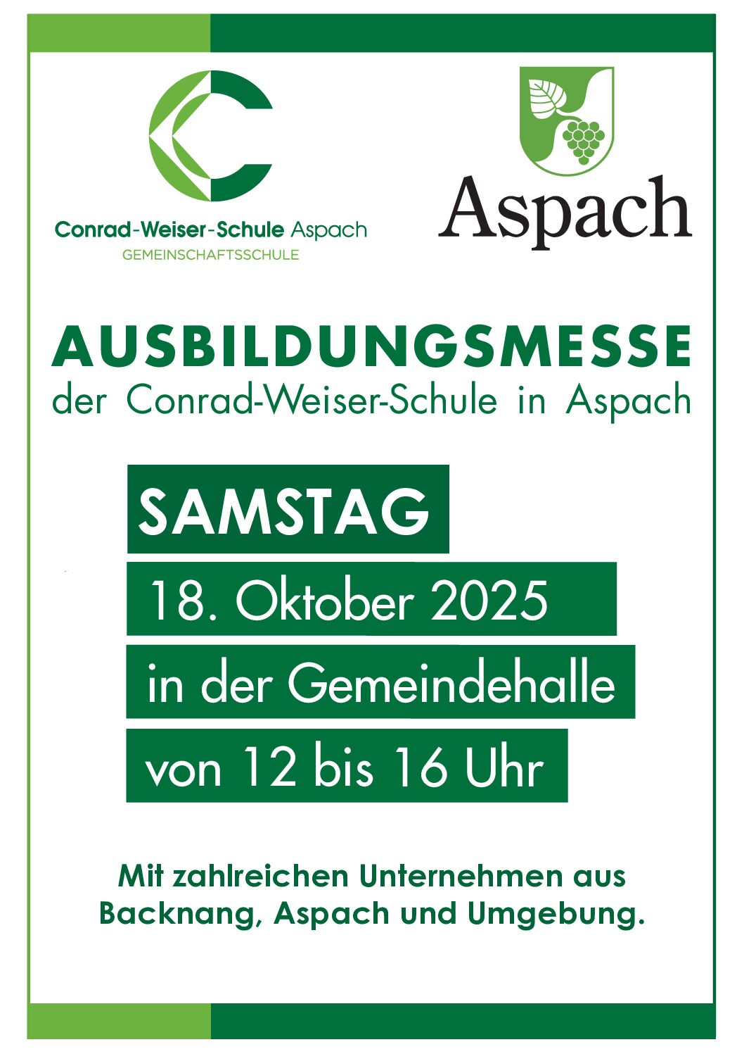 Am Samstag, 18. Oktober 2025, findet in der Gemeindehalle Aspach von 12 bis 16 Uhr die Ausbildungsmesse der Conrad-Weiser-Schule statt.